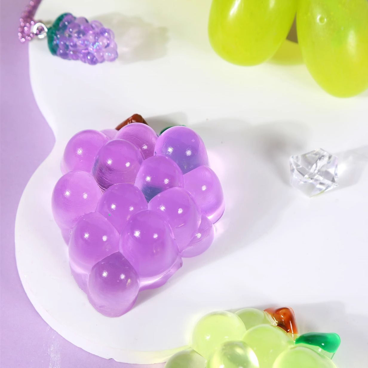 Product Types: Mini fruit sets (strawberry/grape, apple/cherry), Large crystal fruits (individual/combinations), Ice cube series (fruit/capybara shapes), Nebula cat paw
